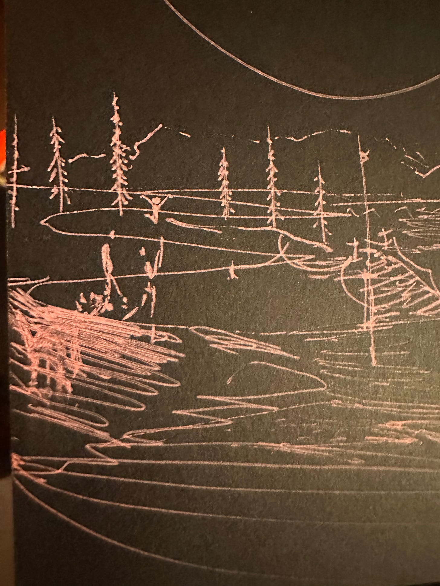 The woman and her child crash below the surface but they don’t come back up. Minutes later I see their bodies both bobbing up some ways closer to me. All they are now are neat ticks in my notebook.